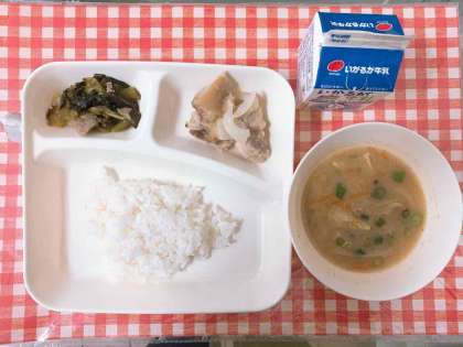 【鶏肉のゆず塩焼き、みそ汁、こまつなの煮びたし、ごはん、牛乳】