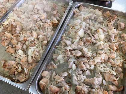 「鶏肉のゆず塩焼き」は、鶏肉に塩とゆず果汁で下味をつけて、たまねぎを混ぜ合わせ、焼き物機で焼いています。ゆずのさっぱりした風味がついて、子どもたちにも人気でした。