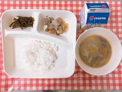 【まぐろの甘辛焼き、豚汁、くきわかめのつくだ煮、ごはん、牛乳】