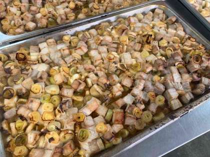 「まぐろの甘辛焼き」は、砂糖、みりん、こいくちしょうゆで下味をつけたまぐろと白ネギを混ぜ合わせ、焼き物機で焼いています。