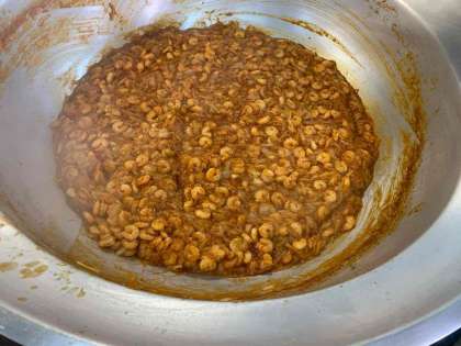 「えびのチリソースいため」は、下ゆでしたえびとたまねぎをしょうが、にんにく、白ねぎ、トウバンジャンで香りよくいため、砂糖、しょうゆ、ケチャップで味付けをしています。