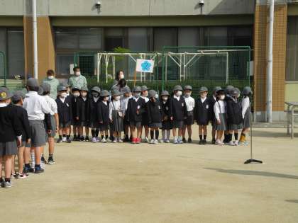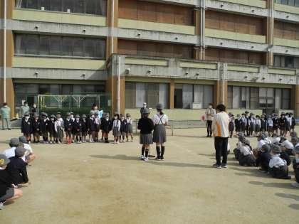 対面式です。担任の先生を先頭に並んで運動場に入場してきました。