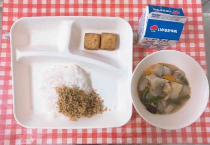 【鶏肉とじゃがいもの煮もの、あつあげのしょうゆだれかけ、紅ざけそぼろ、ごはん、牛乳】