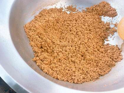紅ざけそぼろは、給食室で手作りしているふりかけです。鮭フレーク、いりごまを火にかけてパラパラにし、料理酒、みりん、うすくちしょうゆ、湯を加えてさらに煎り、最後にあおのりを加えて完成です。