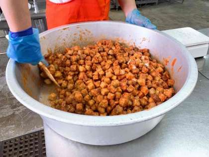 「まぐろのオーロラ煮」は油であげたまぐろに、ケチャップ、砂糖、赤みそで作ったタレをからませています。子どもたちに人気のメニューです。