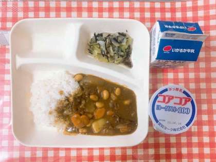 【牛肉と大豆のカレーライス、キャベツのひじきドレッシング、ヨーグルト、牛乳】
