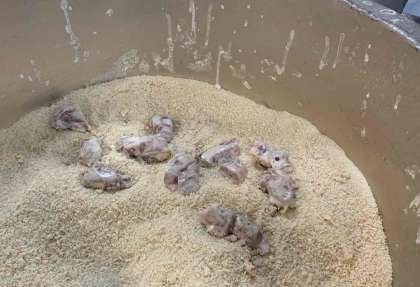 「一口トンカツ」は、豚肉に白ワイン、塩、オールスパイスで下味をつけ、小麦粉、パン粉をつけて揚げています。ひとつずつ、衣をつけています。