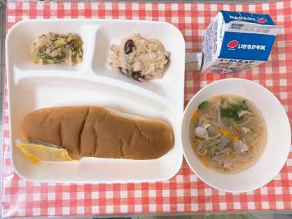 【金時豆の中華おこわ、中華スープ、ツナと野菜のオイスターソースいため、コッペパン、アプリコットジャム、牛乳】