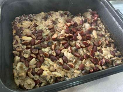 「金時豆の中華おこわ」は、もち米に鶏肉、金時豆、しめじを加えて蒸し焼きにします。「おこわ」とは、昔、もち米を蒸した飯を「強飯(こわいい)」と言いました。ていねい語の「お」をつけて短くし、「おこわ」になったと言われています。