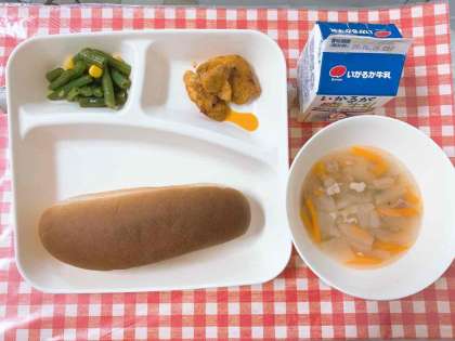 【鶏肉のカレーマヨネーズ焼き、てぼ豆のスープ、さんどまめとコーンのサラダ、黒糖パン、牛乳】