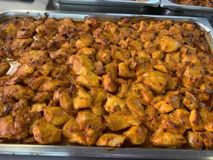 「鶏肉のカレーマヨネーズ焼き」は、鶏肉ににんにく、塩、こしょう。マヨネーズ、ケチャップで下味をつけ、焼き物機で焼いています。子どもたちにとても人気でした。