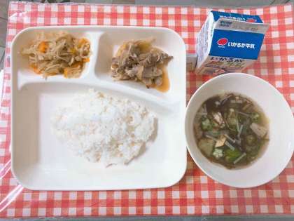 【豚肉の甘辛焼き、もずくとオクラのとろり汁、切り干し大根のいため煮、ごはん、牛乳】