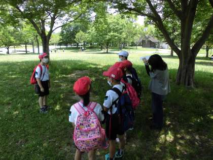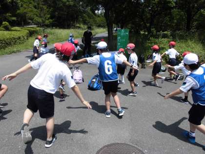 午前は、なかよし班に分かれ、鶴見緑地公園のポイントを回りました。班で協力してゲームに参加し、得点を獲得していきました。