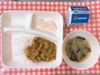 【和風カレー丼、すまし汁、和なし(缶づめ)、牛乳】