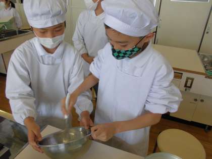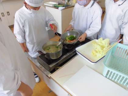 今日は、5年生が調理実習「ゆで野菜サラダ作り」に取り組みました。