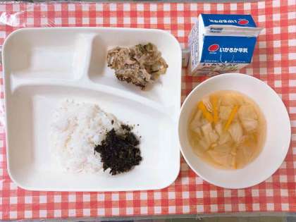 【豚肉のごまみそ焼き、すまし汁、のりのつくだ煮、ごはん、牛乳】