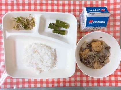 【すき焼き煮、オクラのかつお梅風味、もやしとピーマンのごまいため、ごはん、牛乳】