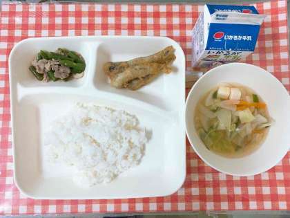 【いわしてんぷら、五目汁、豚肉とさんどまめのいためもの、ごはん、牛乳】