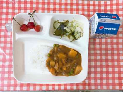 【ハヤシライス、ミックス海そうのサラダ、さくらんぼ、牛乳】