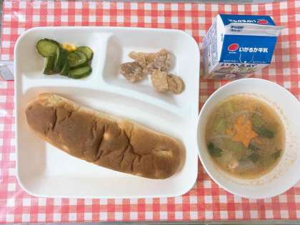 【鶏肉のからあげ、中華みそスープ、きゅうりとコーンの甘酢あえ、おさつパン、牛乳】
