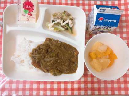 【夏野菜のキーマカレーライス、ゴーヤとツナのマヨネーズ風味、ミックスフルーツ(缶)、牛乳】
