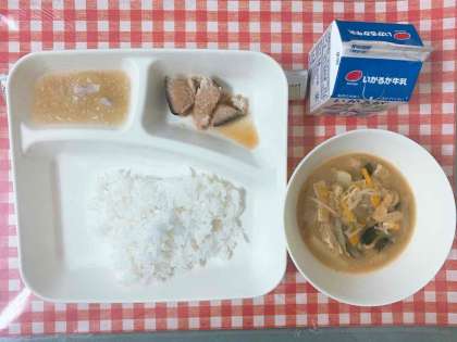 【さけのつけ焼き、みそ汁、とうがんの煮もの、ごはん、牛乳】