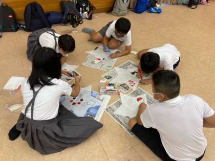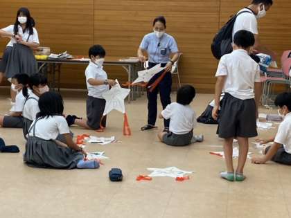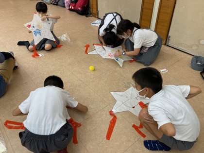 林間学習最後の活動は「星凧作り」です。好きな絵柄を描いて、ひごを組み、凧を仕上げていきます。完成した星凧はみんなのお土産になります。