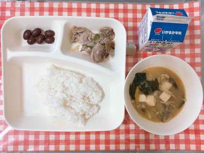 【豚肉の甘辛焼き、みそ汁、金時豆の煮もの、ごはん、牛乳】