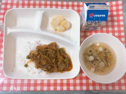 【タコライス、もずくのスープ、焼きじゃが、牛乳】