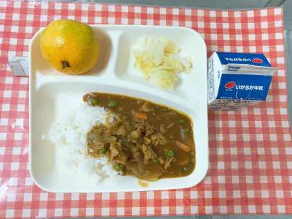 【ポークカレーライス[米粉]、サワーキャベツ、みかん、牛乳】