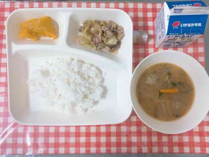 【豚肉と野菜のいためもの、いわしのつみれ汁、かぼちゃういろう、ごはん、牛乳】