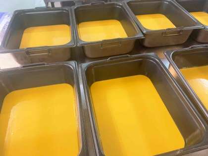 「かぼちゃういろう」は、上新粉、砂糖、水、かぼちゃペーストを混ぜ合わせてミニバットに入れて、焼き物機で蒸しています。名古屋のういろうは「米粉」で、山口県のういろうは「わらび粉」で作られているそうです。