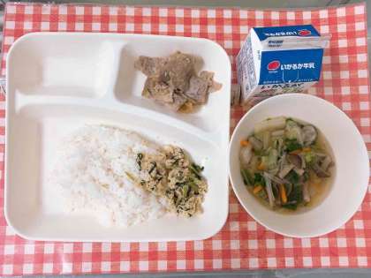【豚肉のスタミナ焼き、すまし汁、とりなっ葉いため、ごはん、牛乳】