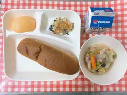 【ほうれんそうのグラタン、スープ煮、白桃(缶)、黒糖パン、牛乳】