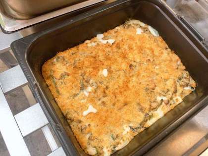 「ほうれんそうのグラタン」は、ベーコン、たまねぎ、マカロニ、ほうれんそうなどの具材が入っています。ほうれんそうは、ビタミンKや鉄がふくまれています。ビタミンKは、血液の凝固に関与し、不足すると止血しにくくなります。
