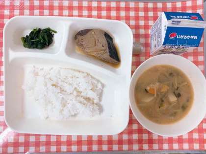【なまりぶしのしょうが煮、じゃがいものみそ汁、ほうれんそうのおひたし、ごはん、牛乳】