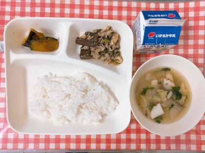 【豚肉と干しずいきのみそ煮、うすくず汁、焼きかぼちゃの甘みつかけ、ごはん、牛乳】