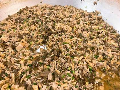 「豚肉と干しずいきのみそ煮」は、豚肉、干しずいき、うすあげ、青ねぎが入っています。干しずいきとは、さといもの葉柄(ようへい)のことで、カルシウムや鉄、食物せんいが多くふくまれます。