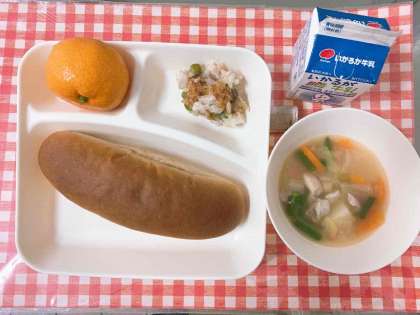 【きのこのドリア、鶏肉とじゃがいものスープ煮、みかん、黒糖パン、牛乳】