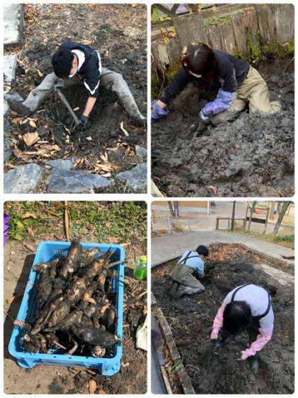 終業式での蓮根料理に向けて、懇談会の合間をぬって、先生たちが蓮根の収穫を行いました。
