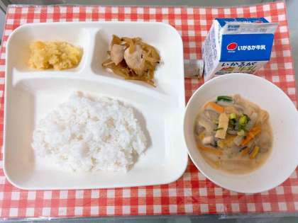 【鶏肉の甘辛焼き、かす汁、くりきんとん、ごはん、牛乳】
