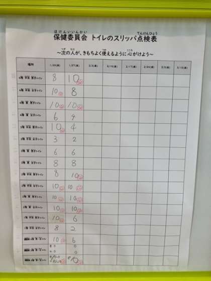 3学期から、毎週金曜日、保健委員会の児童がトイレのスリッパ点検を行っています。スリッパをきれいに揃えるよう、保健委員会が放送しました。