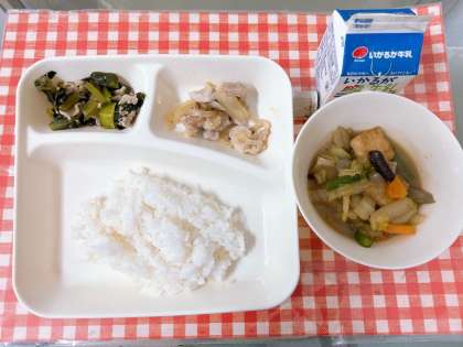 【鶏肉のゆず塩焼き、あつあげと野菜の煮もの、こまつなの煮びたし、ごはん、牛乳】