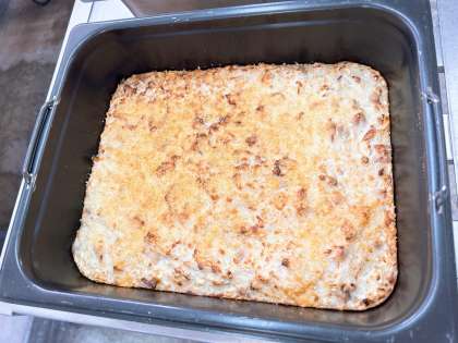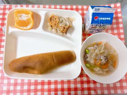【押麦のグラタン、豚肉と野菜のスープ、いよかん、黒糖パン、牛乳】