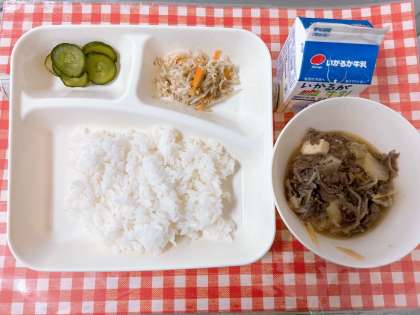 【すき焼き煮、もやしとささみのいためもの、きゅうりのゆず風味、ごはん、牛乳】