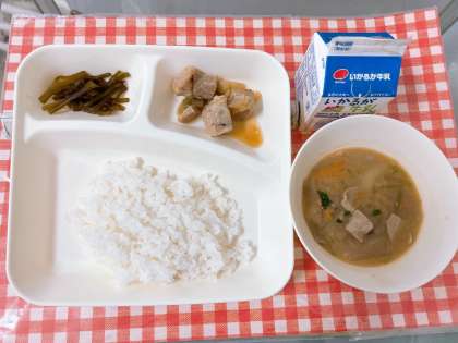 【まぐろの甘辛焼き、豚汁、くきわかめのつくだ煮、ごはん、牛乳】
