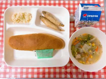 【わかさぎフライ、コーンとはくさいのスープ、カリフラワーのサラダ、コッペパン、りんごジャム、牛乳】