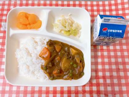 「ハヤシライス」は、小麦粉とサラダ油で作る手作りのブラウンルウを使用しています。子どもたちに人気のメニューです。大きさの違う花型のラッキーにんじんが入っていました。