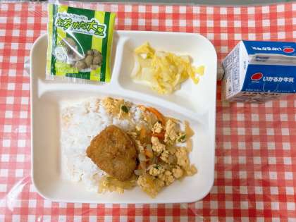 【カツ丼、はくさいの甘酢あえ、まっ茶大豆、牛乳】
