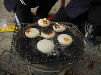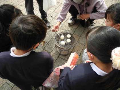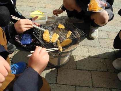 七輪でお餅と干し芋を焼いて食べました。班で七輪を囲みながら、焼き加減をじっくり見守っていました。七輪を初めて使った子も多かったですが、「七輪で焼くと美味しい。」という体験ができました。